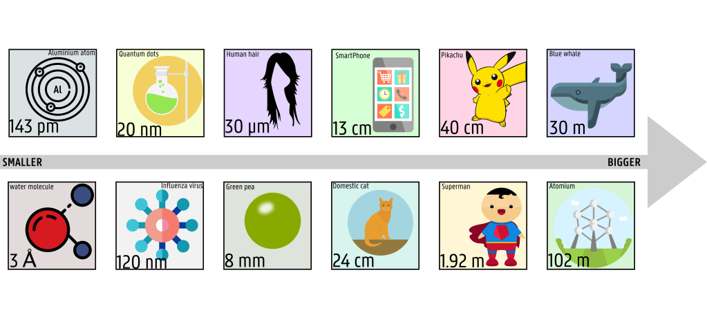 So what are nanomaterials? Any dictionary you open will tell you that it is something that has a size in the nanometre (notation: nm) range – and that a nanometre is equivalent to 10-9 m (or 1/1000000000 of a meter). Ok, so something small. But how small exactly? Let’s start by something quite familiar to us: a green pea, it has an average diameter of 8 mm (or 8×10-3 m), it fits in your hand easily, and it is visible with the naked eye ~ easy-peasy. Now, let’s try something familiar again but smaller: a hair. OK, depending on your type of hair, it might not always be exactly the same, but it will most definitively be in the tens of micrometer (μm) range – which is equivalent to 10-6 m (1/1000000 of a meter). A single hair you should still be able to hold between fingers, though you might need some contrast and better light to be able to see it with your eye. And you will definitively need an optical microscope to see it properly (to see its texture, all the different parts, the damaged end…). And after that, there is not much our own eye can see – without some help from special microscopes. So now, we will have to leave the tangible and continue to dive in scale. If we take something like a common influenza virus, then it is usually around hundreds of nanometre (nm). Ah! So is this a nanomaterial? We cannot see it and touch it (in the sense of feeling its presence on our skin), and it is in the size range of 10-9 m. Well, to be fair, it is still slightly too “big” to be qualified as a nanomaterial. At least, for people like us who work with nanomaterial in the range of tens of nanometres. Typically, some will defined the “actual” range of nanomaterials to be 1-20 nm, but some extent it up to at least 100 nm. It all depends on what you plan to do with it.