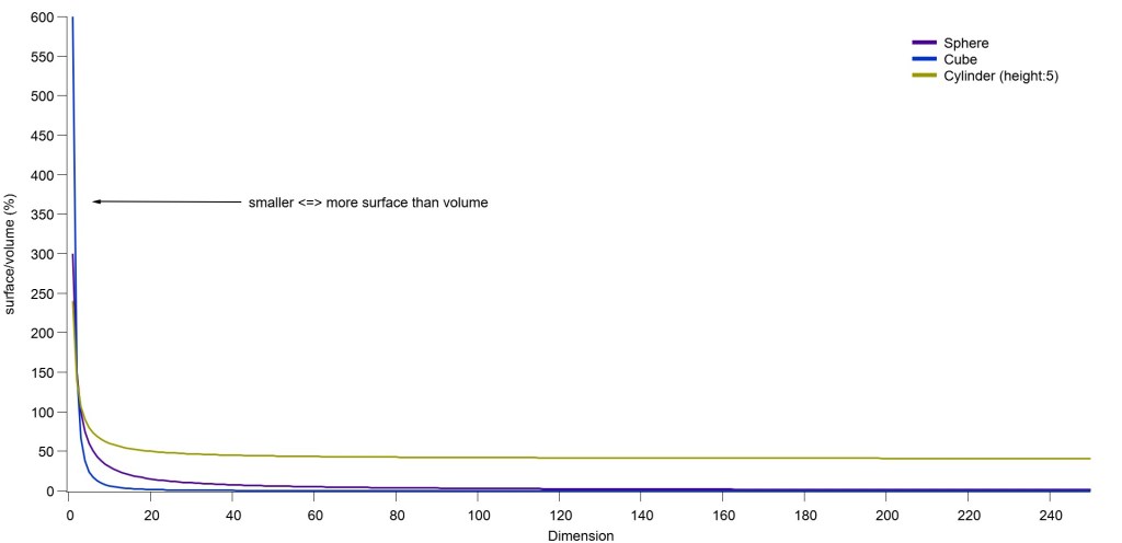Let’s start with a counter-intuitive one: if you scale down something, you increase its surface area, compared to the total volume. Let’s take a simple example: a football ball. There are different sizes for different age group, we can take the biggest one, size 5 with a diameter of 22 cm. Then there is the smallest one of 14 cm diameter. We will have to do some simple maths, to determine their surface area: A=4πr2. And to determine their volume: V=4/3 πr3. With π the Pi number and r the radius (half of the diameter). So let’s do it: the size5 has a surface area of 1521 cm2 and a total volume of 5575 cm3, while the football size1 has a surface area of 616 cm2 and a total volume of 1437 cm3. mmh, well, it seems that I lied no? The smallest football size1 has a smaller surface area than the biggest football size5. What is going on? But I did not lie, what I stated was that when you go smaller, you increase the surface area – compared to its volume. So we need to do some more maths, this time to check this: do we have more “area” than volume for a smaller object? We can just check how much of “area” we have compared to volume, simply by dividing the surface area A by the total volume V: A/V. And to make it easier to interpret the results, we can multiply it by 100, and we obtain… percentage! So we will have an idea of how much area with have per total volume for the two different football sizes. OK, let’s do this. Let’s take football size5 (the biggest one): 1521/5575 x100= 27%. Now let’s try with the smallest football size1: 616/1437 x100= 43%. So what does that mean exactly? Well, we try to see how much “area” was in the volume of our balls. So if we have a lot of area, the percentage calculated will be large too – in other words, we will have much more “area” in the volume. And here it is: the smallest ball (football size1) has almost 50% (half) of itself is surface, while the biggest one (football size5) only has 30% (one third)! Counter-intuitive right? And this applies to all sizes and shapes – even to living beings. But why would that be interesting for us, scientists in our laboratories? Well, a lot of physics and phenomenon happens at the surface. After all, how can a virus enter a cell, without first interacting with its membrane? If you apply paint on a wall, only its surface will be coloured. When you jump in a pool, only the “surface” of the water splash. This is one of the reason it is interesting to scale down our everyday materials: we can increase their yields for a smaller amount of material (volume total). In this case, any material smaller than hundreds of nanometre would be called nanomaterials by their creators.